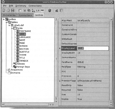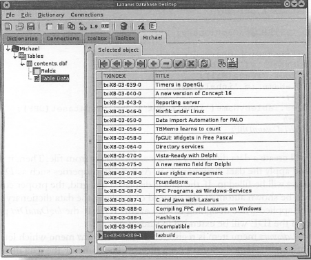 데이터 데스크톱은 기존 데이터베이스로 연결하도록 해주고 그들의 테이블에 있는 데이터를 검사하도록 해주는 (또는 SQL 활성화된 데이터베이스의 경우 테이블에서 쿼리를 실행하도록) 기능을 추가로 제공한다. FPC가 지원하는 모든 데이터베이스로 연결할 수 있다. 필요한 것은 데이터 사전 엔진에 데이터베이스 지원을 등록하는 작은 클래스로 충분하며, 데이터 데스크톱은 그것을 집어 연결 타입을 제공할 것이다. 데이터베이스로의 연결은 Connection→New 메뉴 항목을 통해 이루어진다. 이 항목 아래에는 지원되는 연결 타입의 리스트가 표시된다. 타입을 선택하면 연결 파라미터가 주어지고, 연결을 성공적으로 구축하고 나면 데이터베이스 내용이 표시된 새 탭이 나타난다. DBF 파일로 데이터베이스에 연결하기 위해서는 DBF 파일의 디렉터리가 입력되어야 한다. 따라서 Toolbox 데이터베이스로 연결하기 위해서는 새 'DBF Files' 연결이 시작되어야 함과 동시 DBF 파일을 선택되고, 연결은 Toolbox 라는 이름, 즉 데이터 디렉터리의 이름으로 저장된다. 그 결과 그림 12.18과 같은 화면이 나타날 것이다.