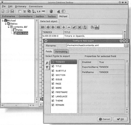 두 번째 탭은 일반 내보내기 옵션을 몇 가지 표시한다. 이는 주로 출력의 포맷을 제어한다. 분명한 점은 옵션들이 내보내기 포맷마다 다르다는 점이다. 마지막으로, 파일명이 대화창 상단에서 채워지고, 그곳에서 주어진 파일명으로 데이터가 내보내진다. 익스포트 메커니즘은 라자루스 애플리케이션에서도 이용할 수 있다: lazDBExport 패키지를 설치 시 컴포넌트 팔레트의 Data Export 페이지로 수많은 컴포넌트가 추가될 것이다. 각 데이터 포맷마다 내보내기 컴포넌트, 그리고 추가로 내보내기 포맷마다 선택 및 구성 대화창을 표시하는 TFPDataExporter 컴포넌트도 애플리케이션에 컴파일되어 있을 것이다.