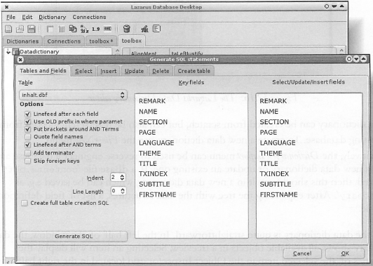 SQL 문의 생성은 [Generate SQL] 버튼 또는 메뉴 항목으로 실행할 수 있다. 클릭하면 델파이의 UpdateSQL 컴포넌트 에디터의 확장된 버전과 비슷한 모양의 대화창이 뜰 것이다. 이 대화창을 이용해 데이터 사전 내 어떤 테이블에서든 데이터를 선택, 업데이트, 삭제, 삽입하기 위한 SQL 문을 생성할 수 있다. 생성된 SQL 문의 형태를 미세하게 조정하기 위해 여러 개의 옵션이 제공된다. 또한 SQL에 테이블의 (또는 그 일부를) 재생성을 위한 SQL 문을 생성 시에도 이용할 수 있다. 이러한 구문들은 자신의 애플리케이션으로 복사가 가능한데, 예를 들어, TSQLQuery 컴포넌트의 다양한 프로퍼티로 복사할 수 있겠다.