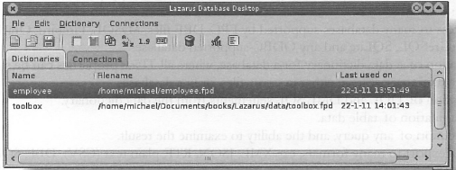앞에서는 데이터를 처리해야 하는 최종 소비자 라자루스 애플리케이션을 어떻게 프로그램화하는지를 살펴보았다. 그러한 애플리케이션을 개발하기 위해서는 데이터베이스를 생성, 설계, 이동시켜야 한다. 데이터베이스 애플리케이션의 생성에는 반복되는 작업이 수반된다. 동일한 데이터에 다른 방식으로 접근하는 폼을 여러 번 생성할 경우, 동일한 작업을 반복하기에 이른다: 디스플레이 이름을 설정하고, 필드 크기를 설정하고, 컨트롤에 힌트를 제공하는 등의 작업 말이다. 데이터베이스 내의 모든 테이블과 필드에 대한 이러한 프로퍼티들의 값은 하나의 구조, 즉 데이터 사전이라 불리는 구조로 넣을 수 있다. 이것은 모든 시각 디자인 정보를 보유하고 IDE에서 또는 런타임 시 적용한다. 데이터 사전은 원할 경우 데이터베이스의 재생성 또는 리모델링에 사용할 수도 있다.