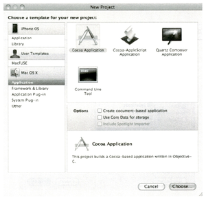 왼쪽 구획에서 Mac OS X 섹션의 Application 을 선택하고, 오른쪽 상단 구획에서 Command Line Tool 을 선택하자.<ref name="주석2">(옮긴이)Xcode 3.1.2 이전 버전을 사용 중이어서 화면이 조금 다른 경우, 왼쪽 구획의 Commane Line Utility 를 선택하고 오른쪽 상단구획의 Foundation Tool | 왼쪽 구획에서 Mac OS X 섹션의 Application 을 선택하고, 오른쪽 상단 구획에서 Command Line Tool 을 선택하자.<ref name="주석2">(옮긴이)Xcode 3.1.2 이전 버전을 사용 중이어서 화면이 조금 다른 경우, 왼쪽 구획의 Commane Line Utility 를 선택하고 오른쪽 상단구획의 Foundation Tool 을 선택한 후 Choose 버튼을 누르면 그림 2.5 같은 새 창을 확인할 수 있다</ref> 이제 그림 2.4 와 같은 창이 나타난다. | ||