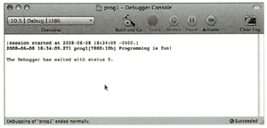만일 프로그램을 짜다가 실수했다면 이 과정에서 오류 메시지가 나타난다. 이럴 경우 뒤돌아가서 오류를 수정하고 위 과정을반복한다. 모든 오류를 프로그램 에서 제거한 후에 Build and Go 를 누르면 prog1 - Debugger Console 이라는 이름이 불은창이 새로뜰것이다. 이 창은 그림 2.8 과 유사한 형태로 프로그램 출력 결과를 보여 준다. 만일 이 창이 자동으로 뜨지 않는다면, 메인 메뉴 바에서 Run 메뉴 아래 콘솔(Console) 항목을 선택한다. 콘솔 칭에 뜨는 실제 콘텐츠에 대해서는 곧 다루겠다. | 만일 프로그램을 짜다가 실수했다면 이 과정에서 오류 메시지가 나타난다. 이럴 경우 뒤돌아가서 오류를 수정하고 위 과정을반복한다. 모든 오류를 프로그램 에서 제거한 후에 Build and Go 를 누르면 prog1 - Debugger Console 이라는 이름이 불은창이 새로뜰것이다. 이 창은 그림 2.8 과 유사한 형태로 프로그램 출력 결과를 보여 준다. 만일 이 창이 자동으로 뜨지 않는다면, 메인 메뉴 바에서 Run 메뉴 아래 콘솔(Console) 항목을 선택한다. 콘솔 칭에 뜨는 실제 콘텐츠에 대해서는 곧 다루겠다. | ||
