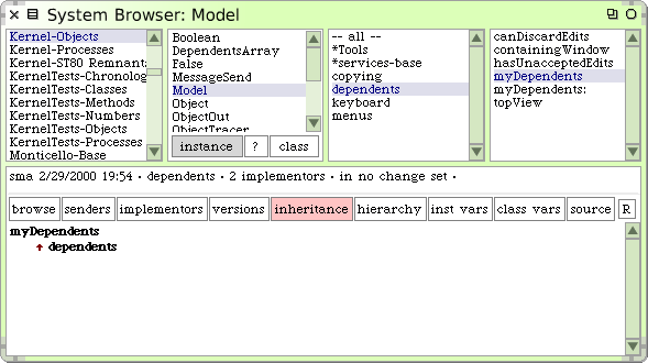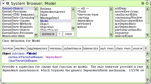 유사하게, 만약 여러분이 두 번째 패널에서 클래스들 중 하나를 선택하였다면, Model(그림 6.2를 보세요), 세 번째 패널은, 디폴트로 선택된 가상 프로토콜 –all-뿐만 아니라, 클래스를 위해 디자인된 모든 프로토콜들을 보여드릴 것입니다. 프로토콜은 메소드들을 그룹 분류(categorizing)하는 방식이며, 메소드들을 더 작게 부수어, 개념적으로 일관성 있는 조각들로 만듭니다. 4번째 pane은 선택된 프로토콜에서 정의된 모든 메소드들의 이름들을 보여드립니다. 만약 여러분이 메소드 이름을 선택하였다면, 브라우저의 아래에 있는 큰 패널에, 여러분이 볼수 있고, 편집할 수 있고, 편집된 버전을 저장할 수 있는 대응하는 메소드의 소스코드가 나타납니다. 만약 여러분이 클래스 Model을 선택하였다면, 프로토콜 dependent와 메소드 myDependents, 브라우저는 그림 6.3과 같이 나타나야만 합니다.