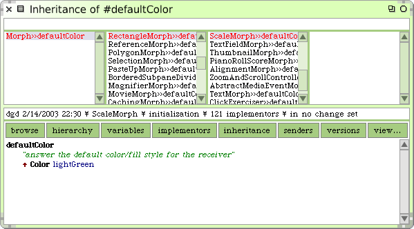 inheritance(상속) 버튼은 표시된 메소드로 재지정된 모든 메소드들을 디스플레이하는 특화된 브라우저를 엽니다. 이 버튼이 어떻게 작동하는지 보시려면, ScaleMorph»defaultColor 메소드를 디스플레이하고, inheritance 를 클릭합니다. 이 메소드 정의는 그림 6.9에 보이는 것 처럼, RectangleMorph»defaultColor 를 재정의하며, 그 재지정 자체는 Morph »defaultColor를 재지정합니다. Inheritance 버튼의 색상은, 재지정이 생기는 방식에 기초합니다. 색상들은 도움말 풍선에 설명됩니다: