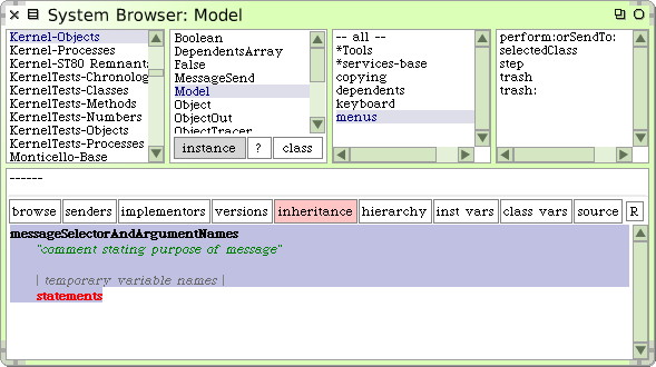 또한 클래스 패널(the class pane)에 있는 노랑 버튼 메뉴에서 사용할 수 있는 것은 class vars이며, 이것은 현재 클래스의 클래스 변수들과 그 클래스 변수들의 값, 그리고 현재 클래스를 직접 참조하는 메소드들의 모든 목록을 디스플레이 하는 class refs(N)을 보여드리는 인스펙터(inspector)를 엽니다.