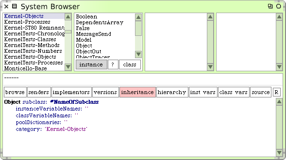 반대로, 새로운 클래스 또는 새로운 메소드를 만들려면, 몇몇 스몰토크 코드를 실제로 작성해야만 합니다. 만약 여러분이 현재 선택된 카테고리(가장 왼쪽 패널) 선택을 해재하고 다시 선택하면, 메인 브라우저 패널은 클래스 생성 팸플릿(그림 6.4)을 디스플레이 합니다. 여러분은 이 탬플릿을 편집함으로써, 새로운 클래스를 만듭니다: 서브클래스(subclass)를 만들기 원하는 현존하는 클래스의 이름으로 오브젝트(Object)를 교체하고, 여러분의 새로운 서브클래스에 부여하기를 원하는 이름으로 NameOfSubclass를 교체한 다음, 만약 알고 계실 경우, 인스턴스 변수이름들을 채워 넣습니다. 새로운 클래스를 위한 카테고리는 디폴트로 현재 선택된 카테고리이지만, 여러분께서 원하실 경우, 이 카테고리를 변경하실 수 있습니다. 여러분이 하위분류하기를 원하는 클래스에 이미 브라우저가 집중되어 있다면, 클래스 패널에서 노랑버튼메뉴를 사용하거나 more ▷. . . . subclass template 를 선택하여 약간 다른 초기화로 동일한 템플릿을 얻으실 수 있으며, 좀더 하위의(subclass) 템플릿을 선택할 수 있습니다. 또한 클래스 이름을 새로운 것으로 변경하여, 현존하는 클래스 (existing class)의 정의를 편집하실 수 있습니다. 대부분의 경우, 새로운 정의를 수락하면, 새로운 클래스(the #를 따르는 이름을 가진)가 만들어집니다(대응하는 메타 클래스이므로). 클래스를 만드는 작업은, 클래스를 참조하는 글로벌 변수를 생성케 하며, 그 작업은 클래스의 이름들을 사용하여 모든 현존하는 클래스들을 참조할 수 있게 만드는 기초가 됩니다.