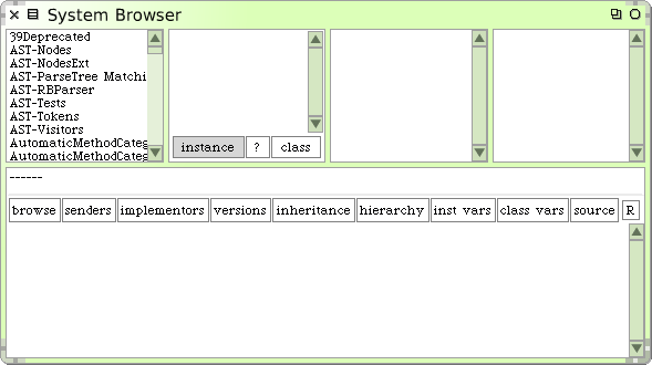 스퀵에서는 사실 여러 개의 브라우저가 있습니다: 표준 시스템 브라우저(the standard system browser), 패키지 브라우저(the package browser), 옴니브라우저(the omnibrowser) 그리고 리펙토링 브라우저(Refactoring Browser)가 존재합니다. 우리는 먼저 표준 시스템 브라우저를 볼 것이며, 그 이유는 다른 브라우저들은 그 위에 변수들이 있기 때문입니다. 그림 6.1은 여러분이 도구Flap[1]에서 처음 브라우저를 외부로 드레그 하였을 때 의 모습을 보여줍니다.