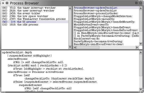 먄약 왼쪽 상단 패널에서 프로세스를 선택한다면, 선택한 프로세스의 stack trace 정보가 상단 오른쪽 패널에 디버거처럼 디스플레이 됩니다. 만약 오른쪽 상단의 stack 프레중 하나를 선택한다면, 해당되는 메소드가 하단 패널에 표시됩니다. 프로세스 브라우저는 self와 thisContext를 위한 mini-inspectors 는 없지만, stack 프레임에서 사용할 수 있는 노랑 버튼 메뉴 아이템들은 디버거의 mini-inspector 기능과 동일한 수준의 기능을 제공합니다.