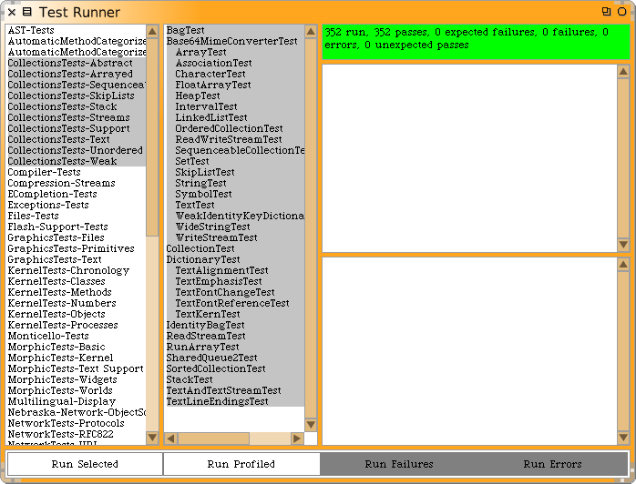 테스트들을 실행하는 가장 쉬운 방법은 SUnit Test Runner를 사용하는 것이며, 이것은 World ▷ open... 메뉴를 사용하거나 도구 플랩(the Tools flap)에서 TestRunner를 드레그하여 열수 있습니다. 그림 7.1에 보이는 TestRunner는 테스트들의 그룹들을 쉽게 실행할 수 있도록 디자인 되었습니다. 테스트 클래스들(예를 들어 TestCase의 서브클래스들)를 포함하고 있는 모든 시스템 카테고리들을 열거하며, 이 카테코리들 중 몇 개가 선택되면 그 카테고리들이 포함하고 있는 테스트 클래스들은 그 패널의 오른쪽 패널에 나타납니다. 추상 클래스들은 이텔릭체로 인쇄되어 있으며, 테스트 클래스 계층도(the test class hierarchy)는 들여쓰기되어 나타나므로, ClassTestCase의 서브클래스들은 TestCase의 서브클래스들보다 더 들여쓰기 되어 표시됩니다.