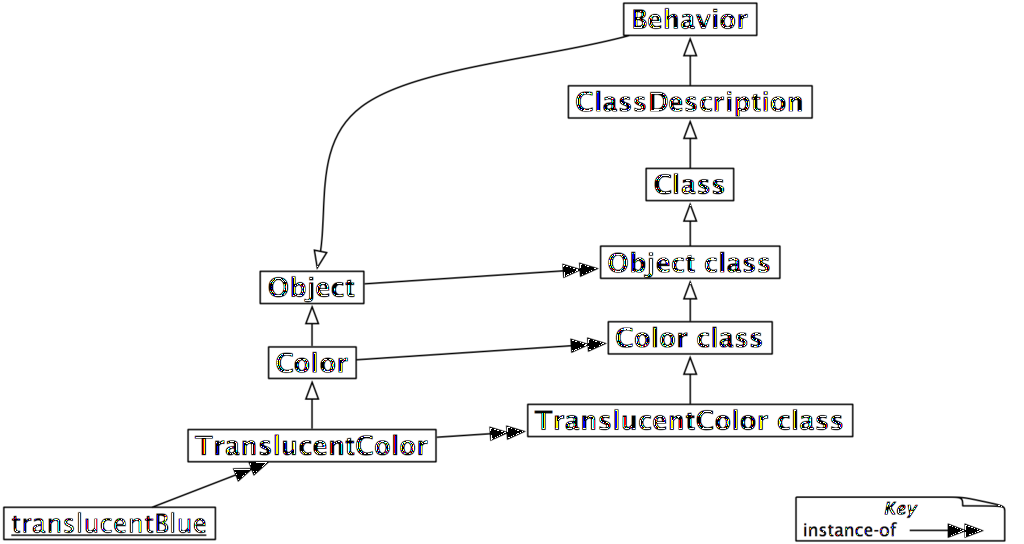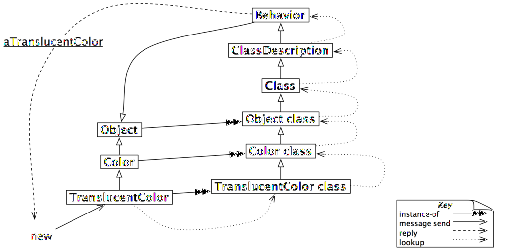 TranslucentColor new 발송의 결과가, 메서드가 클래스 Behavior에서 검색(look up)이 되지 않을 지라도 TranslucentColor의 인스턴스이며 Behavior의 인스턴스가 아닌 것에 유의합니다. new는 항상 self의 인스턴스를 리턴하며, 심지어 다른 클래스에서 실행되었을 지라도, 메시지를 수신하는 클래스인 self의 인스턴스를 리턴합니다.