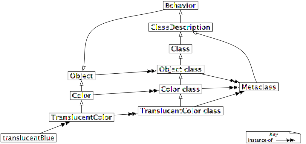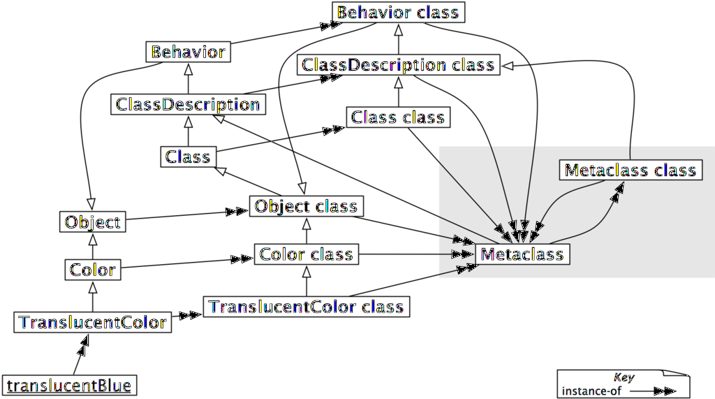 메타클래스는 공통 메타 클래스 동작(metaclass behavior)을 나타냅니다. 그것은 초기화된 메타클래스의 단일 인스턴스들과 클래스 변수들의 초기화, 메타클래스 인스턴스(metaclass instace), 메서드 편찬(method compilation), 그리고 클래스 정보를 만드는[상속 링크(inheritance links), 인스턴스 변수(instance variables)등] 인스턴스 생성(subclassOf)을 위한 메서드들을 제공합니다.