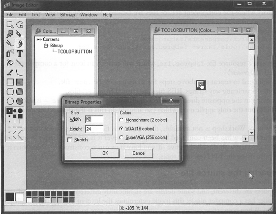 비트맵의 이름은 컴포넌트 이름의 대문자 버전으로 되어야 한다. 소스 파일에 {SR *.dcr} 문을 종종 볼 수 있을 것이다. 보통 컴포넌트의 이미지를 생성하는 툴은 델파이의 이미지 에디터였을 것이다.