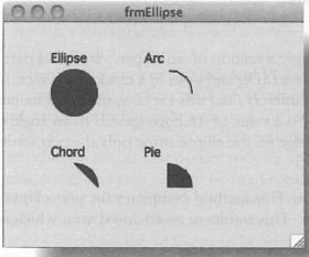 Ellipse 메소드는 직사각형 영역 내에 원형이나 타원형을 그린다. 그 둘레는 Pen 설정으로 그려진다; 영역은 현재 Brush로 채운다. 이러한 절차는 두 가지 변형을 가진다: 하나는 TRect의 폼 내에 포함 직사각형(enclosing rectangle)의 점을, 다른 하나는 상단 좌측과 하단 우측 모서리 좌표를 바로 X와 Y 값으로 취한다. 원형은 특별한 타원형에 불과하므로 따로 루틴은 없다. 타원형을 둘러싼 직사각형을 정사각형으로 정의함으로써 원형을 그린다.