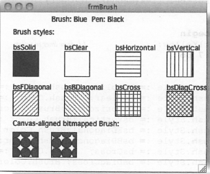 캔버스의 가장 중요한 기본 프로퍼티는 그리기 브러시(원이나 직사각형을 그릴 때 표면을 채우는) Style과 Color 이다; 객체의 윤곽과 어떤 선이나 곡선을 그리는 데 사용되는 Pen, 그리고 데이터를 출력하는 데 사용되는 Font. TCanvas 클래스는 애플리케이션의 기본 그리기 연산을 처리한다. 그 이상의 연산이 필요할 경우 본인이 알아서 구현하면 될 일이다.