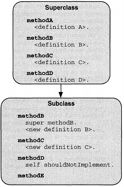 생각해보면 스몰토크의 상속 메커니즘을 슈퍼클래스로부터 행위를 삭제, 수정 또는 추가하기 위한 서브클래스를 얻는 데 사용할 수도 있음을 알 수 있을 것이다 (다음 페이지 다이어그램 참고). 행위의 추가는 단순히 더 많은 메서드를 정의하거나, 특정 메서드를 재정의(오버라이딩)한 후 super로의 호출에 넣음으로써 가능하다. 행위의 수정은 다른 일을 행하는 메서드를 오버라이드하여, 상속된 본래 기능을 교체함으로써 가능하다. 스몰토크에서 행위의 삭제는 self shouldNotImplement 표현식을 포함하는 메서드로 기존 메서드를 오버라이드하여 가능하다. 누군가 당신의 코드로 해당 메시지의 전송을 시도할 경우 예외를 발생시킬 것이다.