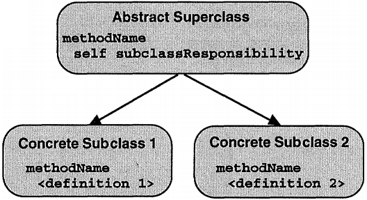 메서드에 대한 인터페이스부를 슈퍼클래스에서 정의하여 서브클래스에서 구현할 때 당신은 여전히 다른 슈퍼클래스 코드에 not-yet-implemented(아직 구현되지 않은) 메서드를 호출할 수 있다. 예를 들어, Magnitude 클래스에는 < 메서드가 정의되어 있지만 구현되어 있지 않다. 하지만 이후 Magnitude에서 > 메서드의 구현에 사용된다. 이는 Magnitude의 구체적 서브클래스는 고유의 <를 구현할 것이기 때문에 괜찮으며, 상속된 >가 그 메서드를 호출하고 그에 따라 적절하게 작동할 것임을 의미한다. 분명하지 않다면 이 영역에서 시스템 클래스 계층구조를 살펴보고, 그 외 예는 런처에서 browse->senders를 이용하면 subclassResponsibility를 사용하는 모든 메서드와 클래스를 볼 수 있을 것이다.