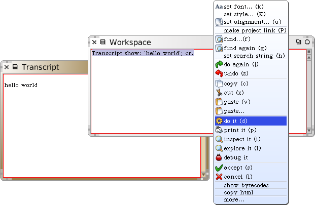 방금 첫번째 스몰토크 프로그램식을 처리했습니다! Transcript 객체에 메시지와 cr[개행 문자(carrige return)] 가 따라오는 show: 'hello world' 메시지를 보냈습니다. Transcript 는 따라오는 메시지로 무엇을 해야 할 지 결정하려고 했고 show: 와 cr 메시지를 다루기 위한 메서드를 찾았으며, 적절하게 반응하였습니다.