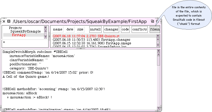 이러한 작업을 수행하는 가장 쉬운 방법은 코드를 파일로 내보내기filing out 하는 것입니다. 시스템 카테고리 pane 에서 노랑 버튼 메뉴는, SBE-Quinto 카테고리의 전체 내용을 파일로 내보내기 위한 옵션을 제공합니다. 이 작업의 결과로서 나온 파일은 사람이 읽기에는 좀 더 어렵지만, 컴퓨터를 위한 파일이며 사람을 위해 만들어진 것은 아닙니다. 이 파일을 친구에게 이메일로 보낼 수 있으며, 친구들은 파일 목록 브라우저the file list browser를 사용해서, 그들의 스퀵 이미지에 파일을 넣을 수 있습니다.