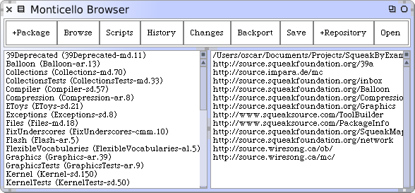 몬테첼로 패키지 브라우저를 사용해서, FTP 와 HTTP 서버를 포함한 다양한 방법으로 서버에 있는 저장소에 패키지를 저장할 수 있으며, 또한 로컬 파일 시스템 디렉터리에서 패키지를 바로 작성할 수도 있습니다. 패키지의 사본은 항상 로컬 하드 디스크의 package-cache 폴더에 캐쉬됩니다. 몬테첼로Monticello는 사용자의 프로그램에 대해 다양한 버전을 저장하고, 버전을 병합하며, 이전 버전으로 되돌리고, 버전간의 차이를 탐색할 수 있게 합니다. 몬테첼로는 정확히 말해서 분산 수정사항(revision) 관리 시스템이며, 이는 몬테첼로가 CVS 또는 subversion 처럼, 개발자들의 작업을 다양한 장소에 저장할 수 있게 해준다는 의미입니다.